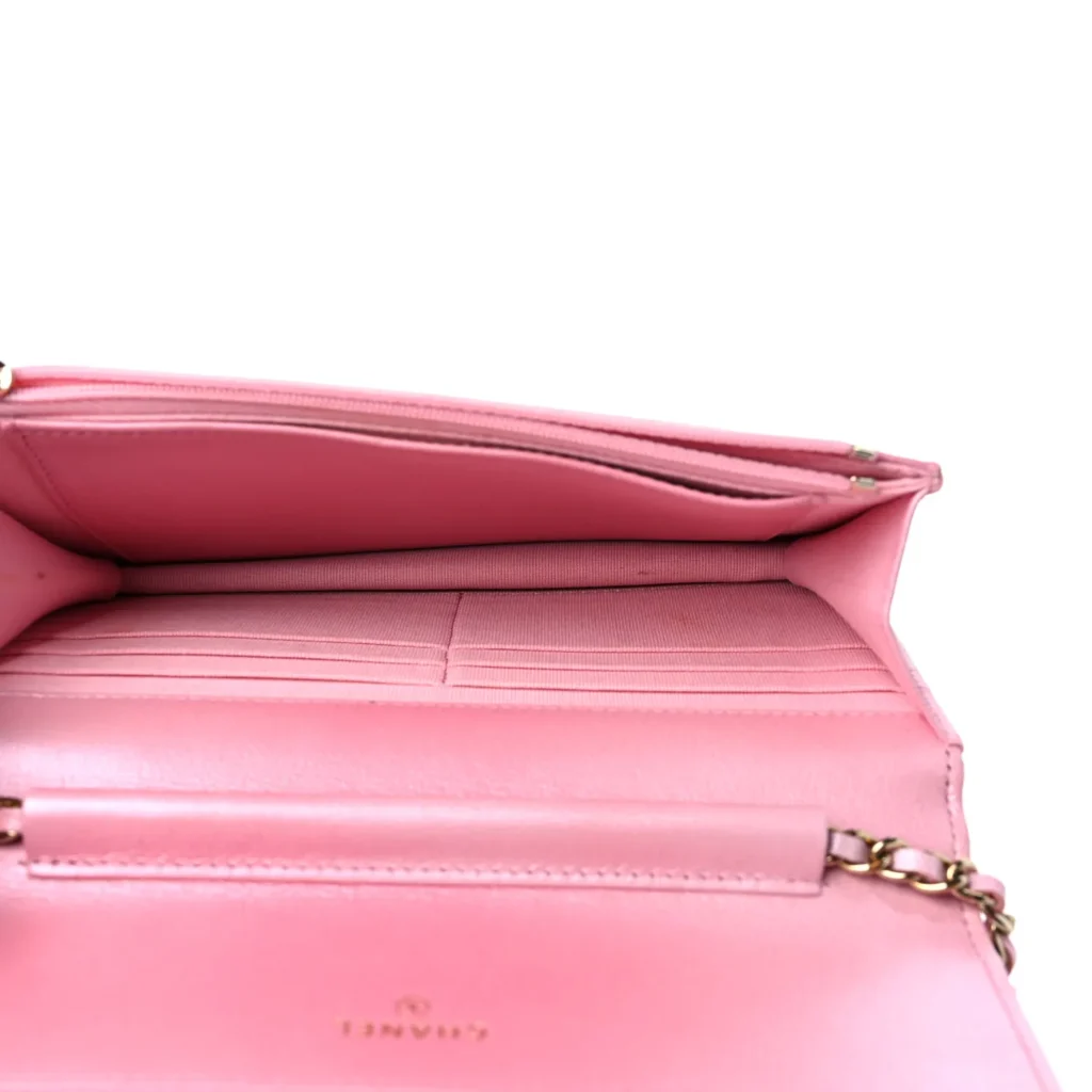 The classic Chanel Wallet on Chain bag is a slim and compact bag with a single gusset. On the outside, there is a back pocket on the WOC, and the front features the iconic CC logo. The leather and chain strap is long, making the Wallet on Chain an ideal bag for crossbody wear. On the inside, the Chanel WOC opens to a compact fabric interior with 6 card slots, a patch pocket, and a zippered compartment.